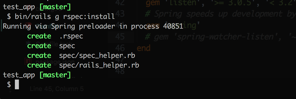 $ bin/rails g rspec:installTo complete the installation, we have to inform rspec to use capybara so add this line on spec_helper: