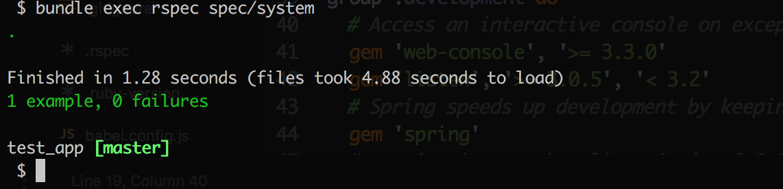 $ bundle exec rspec spec/systemif everything is fine you should see this screen on your terminal: